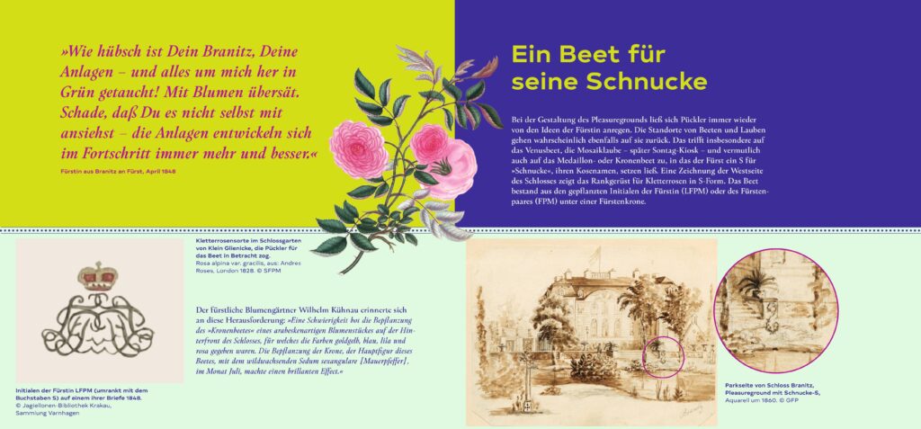Im Pleasureground zeigen sich Lucies Ideen besonders sinnlich. Beete, Lauben und Schmuckpflanzungen wurden zu Trägern persönlicher Botschaften. Das berühmte „Schnucke‑S“, benannt nach ihrem Kosenamen, zeugt von der emotionalen Verbundenheit des Fürstenpaares und von der hohen Kunst gärtnerischer Gestaltung. Für die Ausstellung wurde das historische Beet neu interpretiert – als behutsamer Kompromiss zwischen überlieferten Quellen, heutiger Pflegepraxis und damaliger Wirkung.