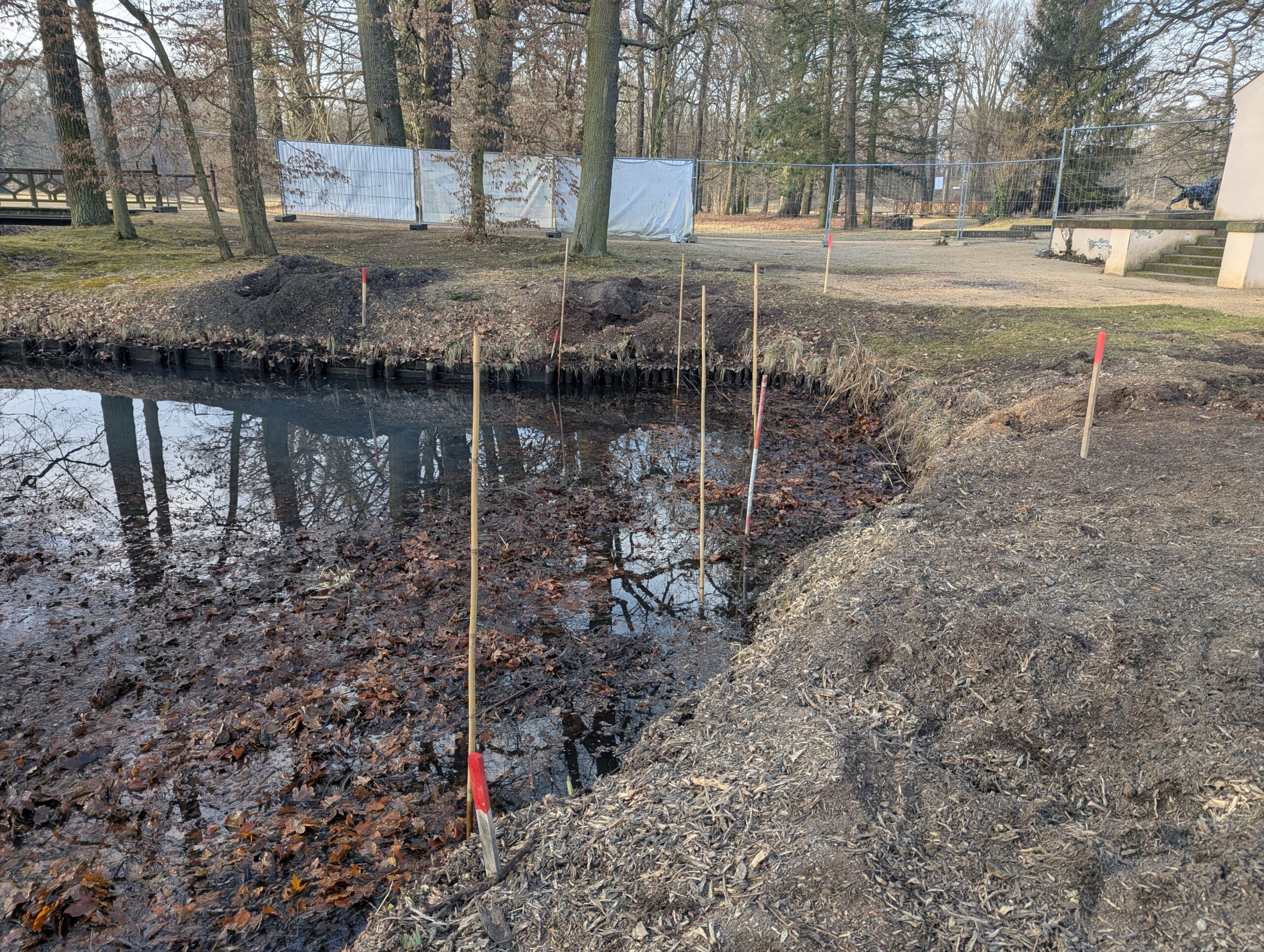 Am Blumensee wurde die neue Uferlinie festgelegt. Danach wurde der Baustellenbereich gekennzeichnet und eingerichtet.