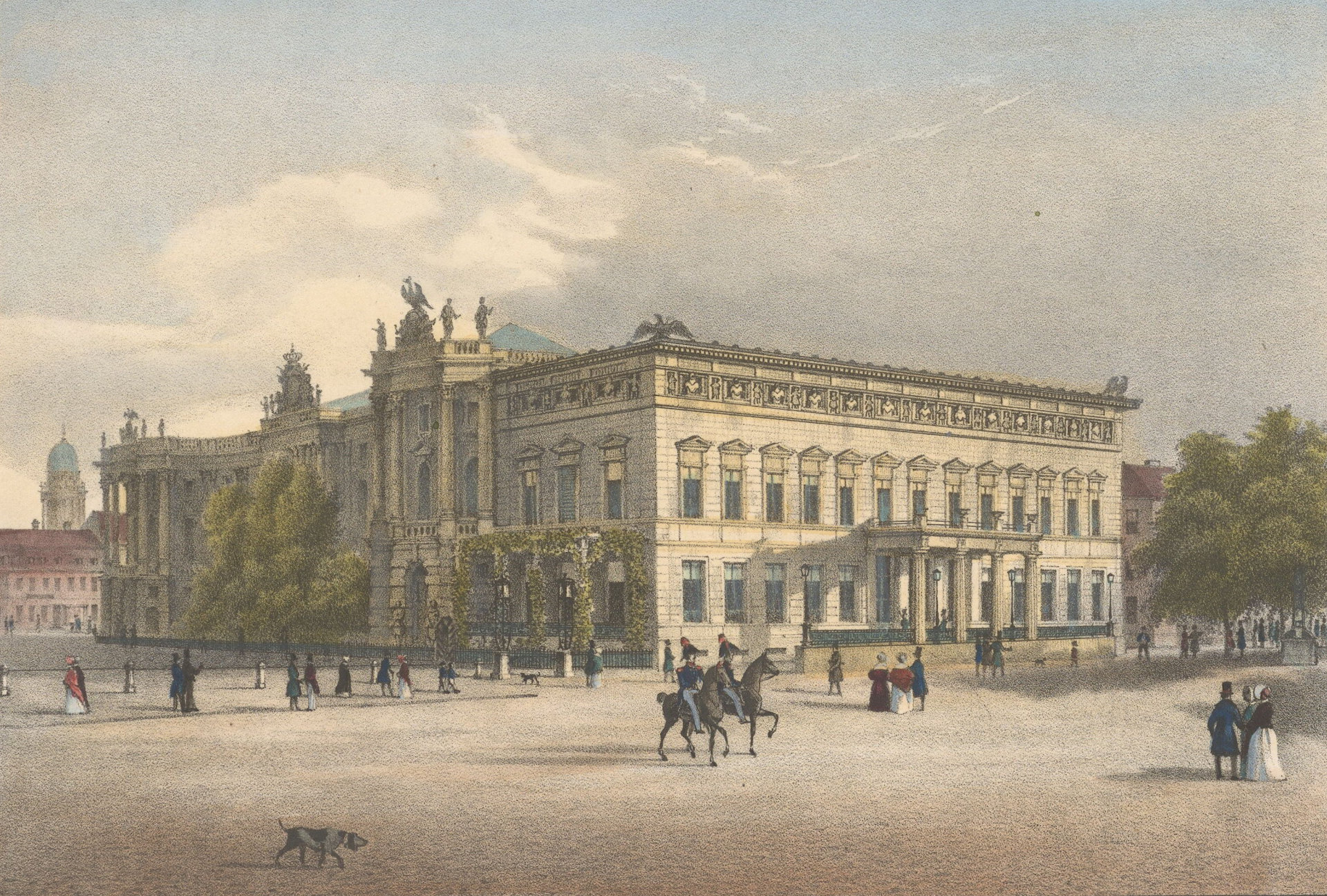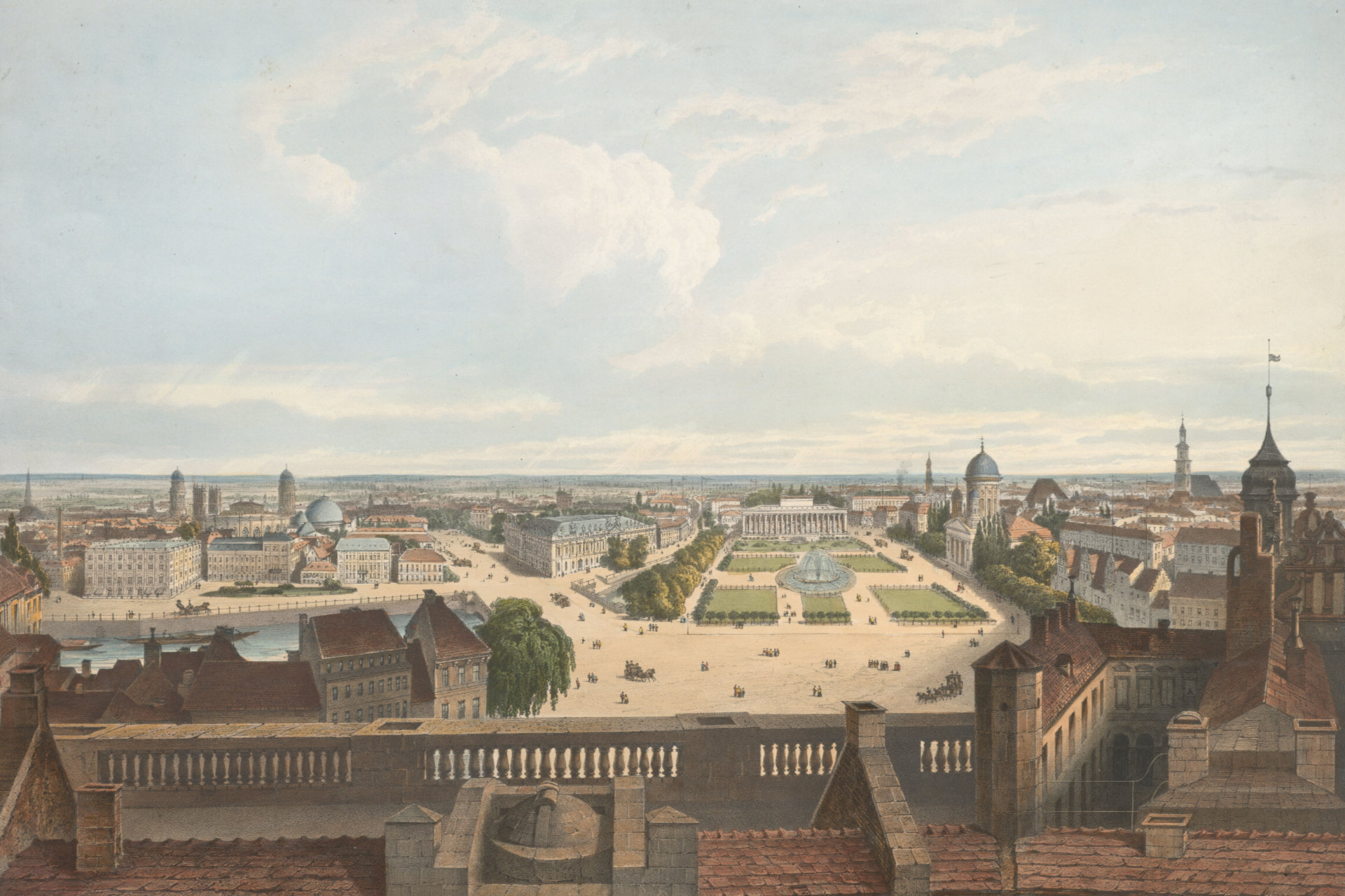 Nördlich des Berliner Schlosses auf der Spreeinsel liegt der Lustgarten. Hier zu sehen nach der Umgestaltung durch den Landschaftsgärtner Peter Joseph Lenné 1826–1829. Lenné hatte auch für Lucies Vater auf Schloss Glienicke gearbeitet und besuchte Muskau im Sommer 1832.