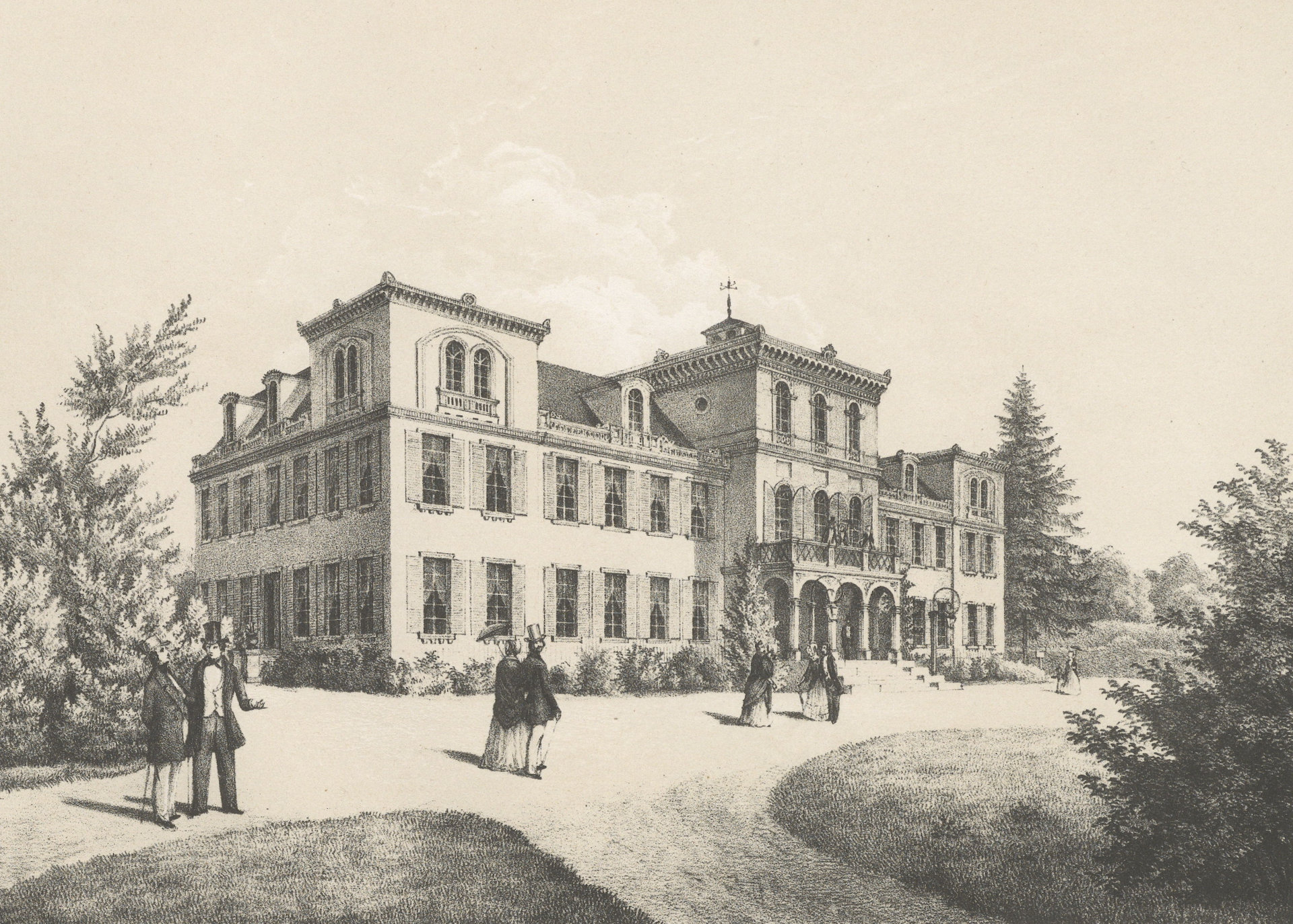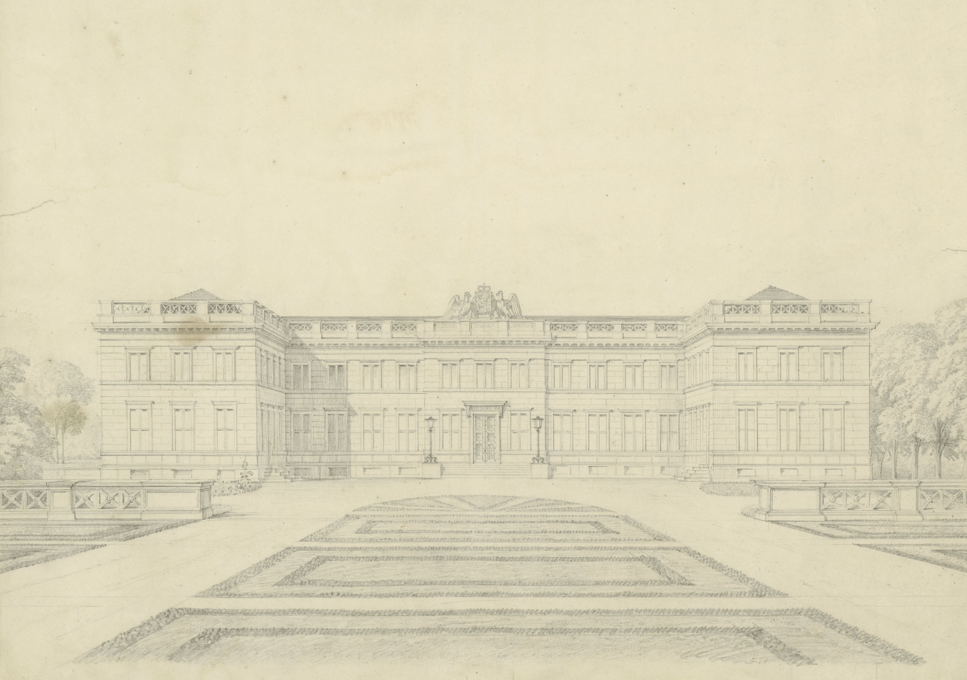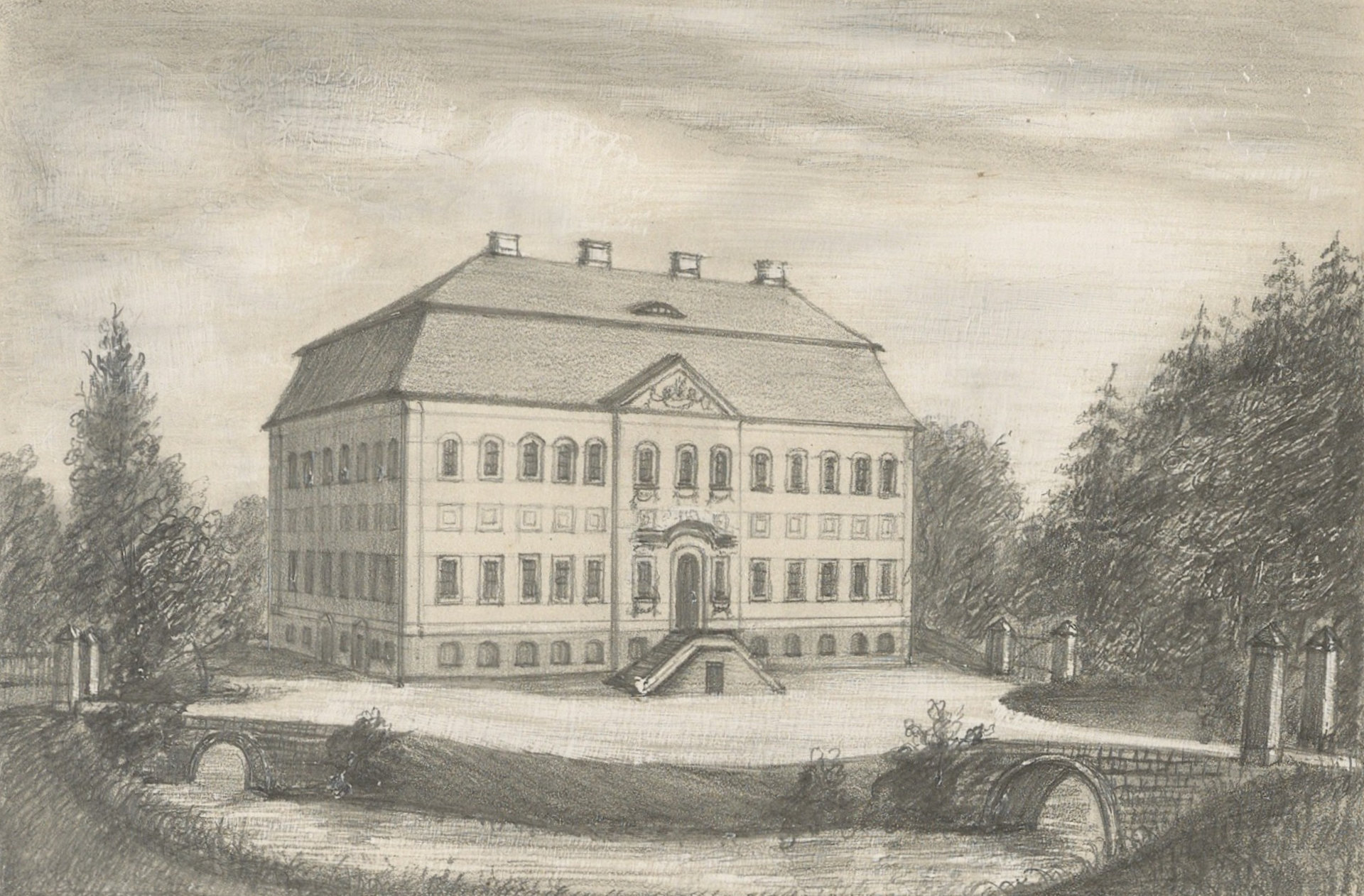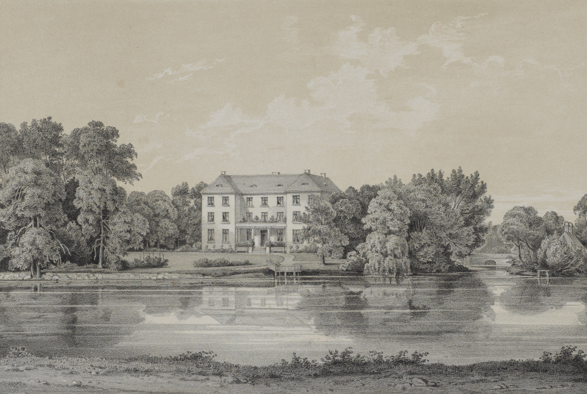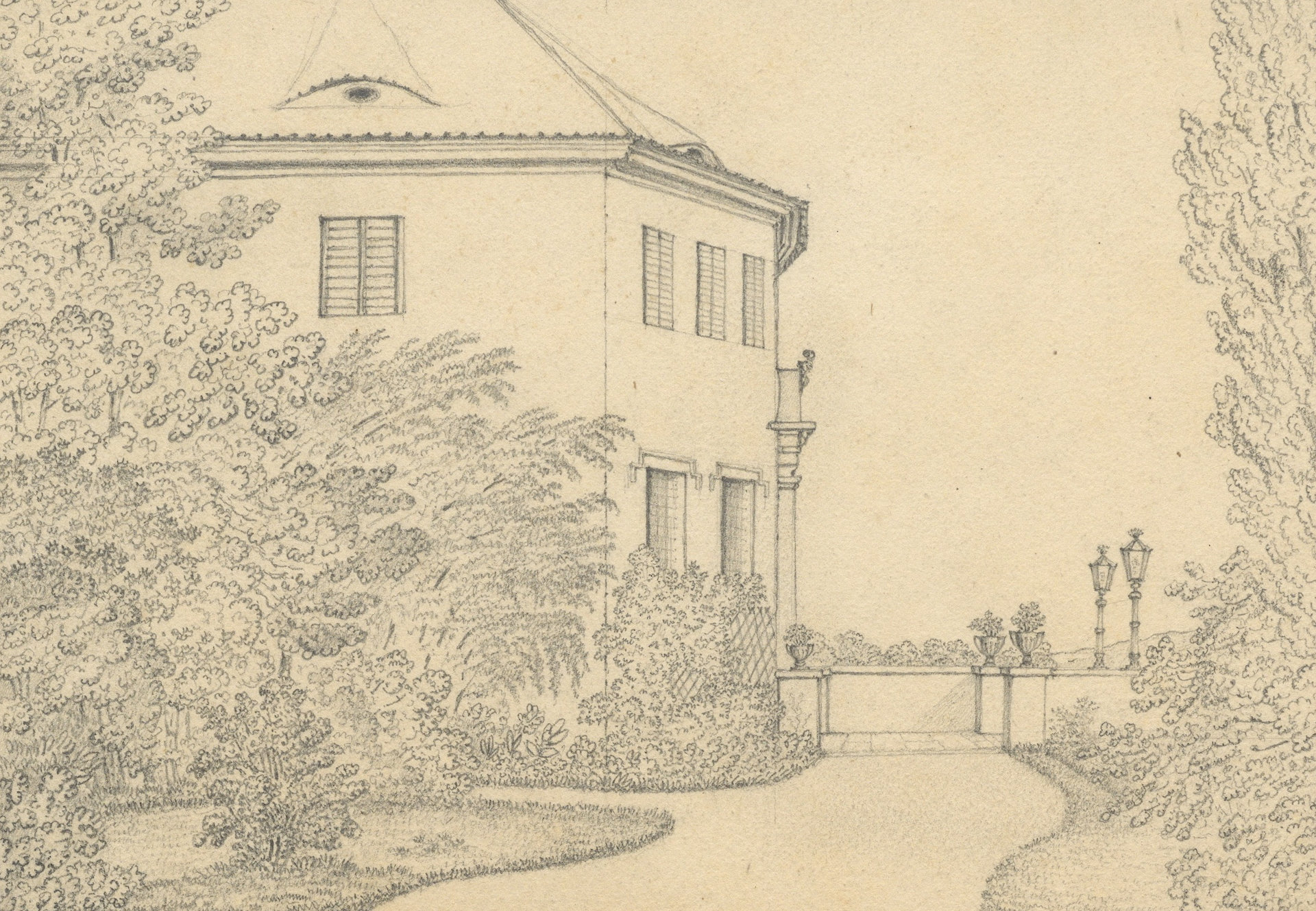 Die Zeichnung von Lucies Sekretär Billy Masser zeigt Schloss Branitz 1845 in dem Zustand, in dem Lucie es nach dem Auszug aus Muskau erstmals bezog. Später sollten an dieser Stelle die von der Fürstin erdachte Terrasse und der Pleasureground entstehen.