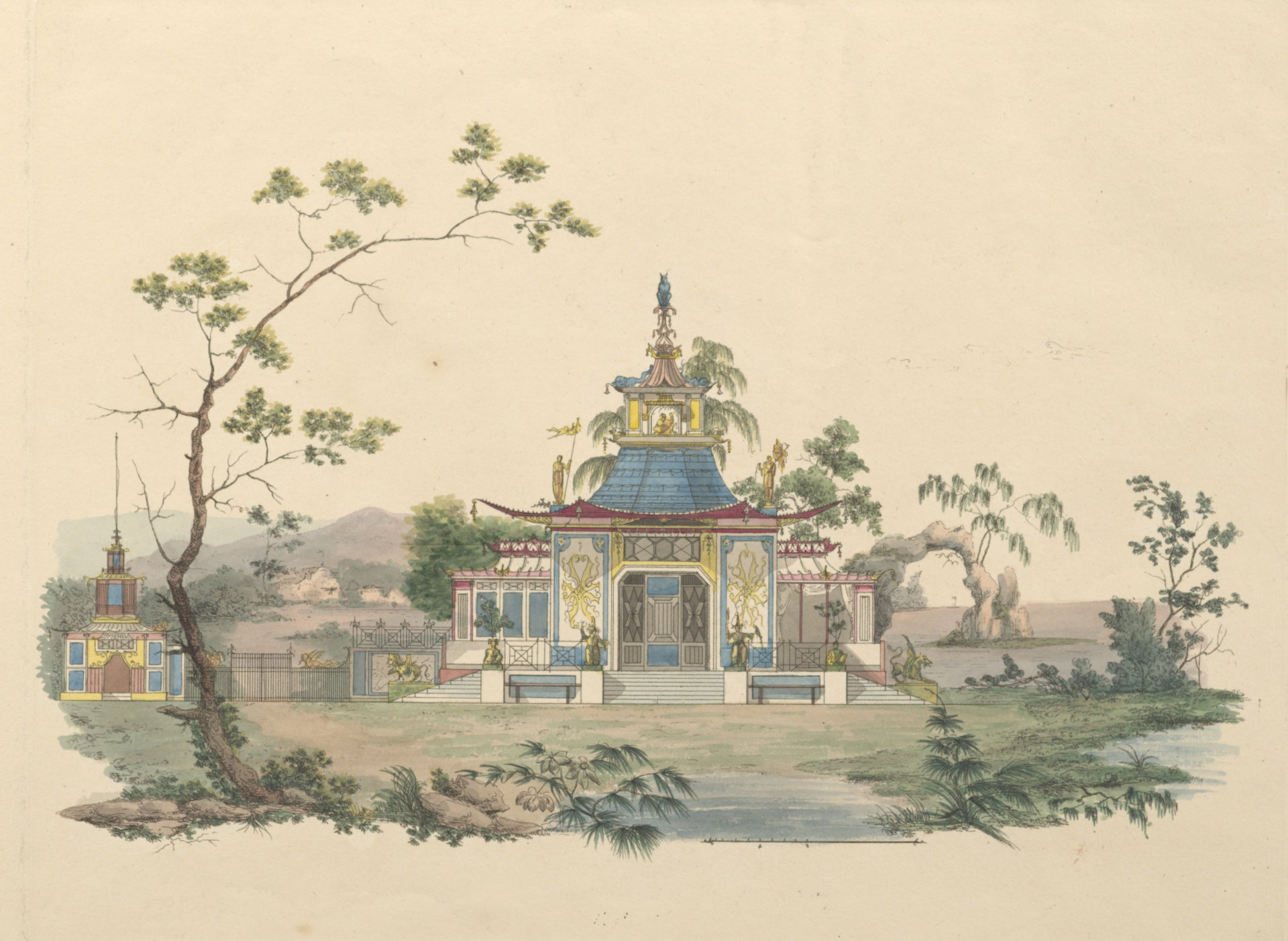 Unter dem Titel „Architectural Decorations“ veröffentlichte Landi 1810 etwa 30 handkolorierte Ansichten dekorativer Bauelemente, die sich lose an ägyptischer, gotischer oder wie hier chinesischer Architektur orientierten.