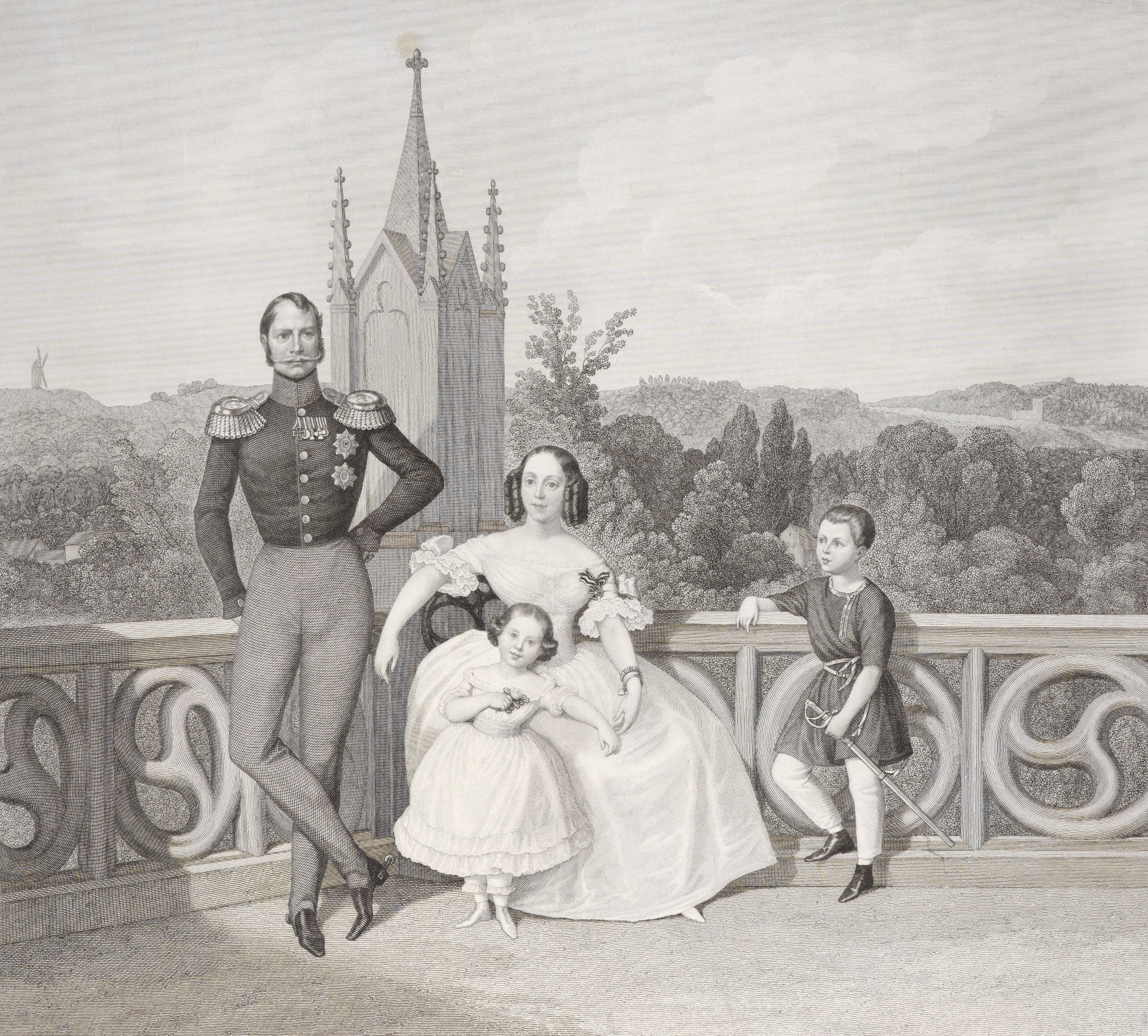 Zu sehen sind Prinz Wilhelm von Preußen und seine Frau, Prinzessin Augusta von Sachsen-Weimar-Eisenach, mit ihren Kindern Friedrich Wilhelm und Luise. In die Gestaltung von Terrassen und Schlosspark Babelsberg ist das Fürstenpaar auf Wunsch des Prinzen eingebunden.