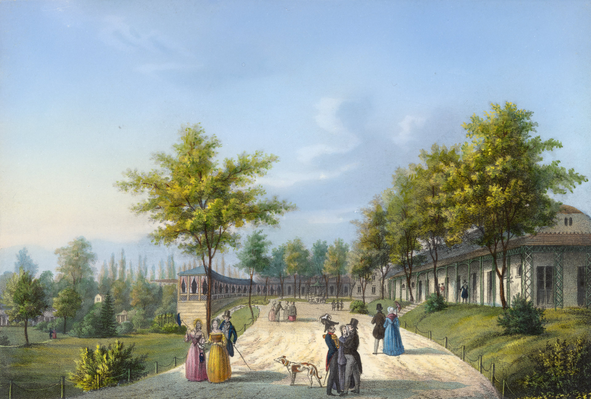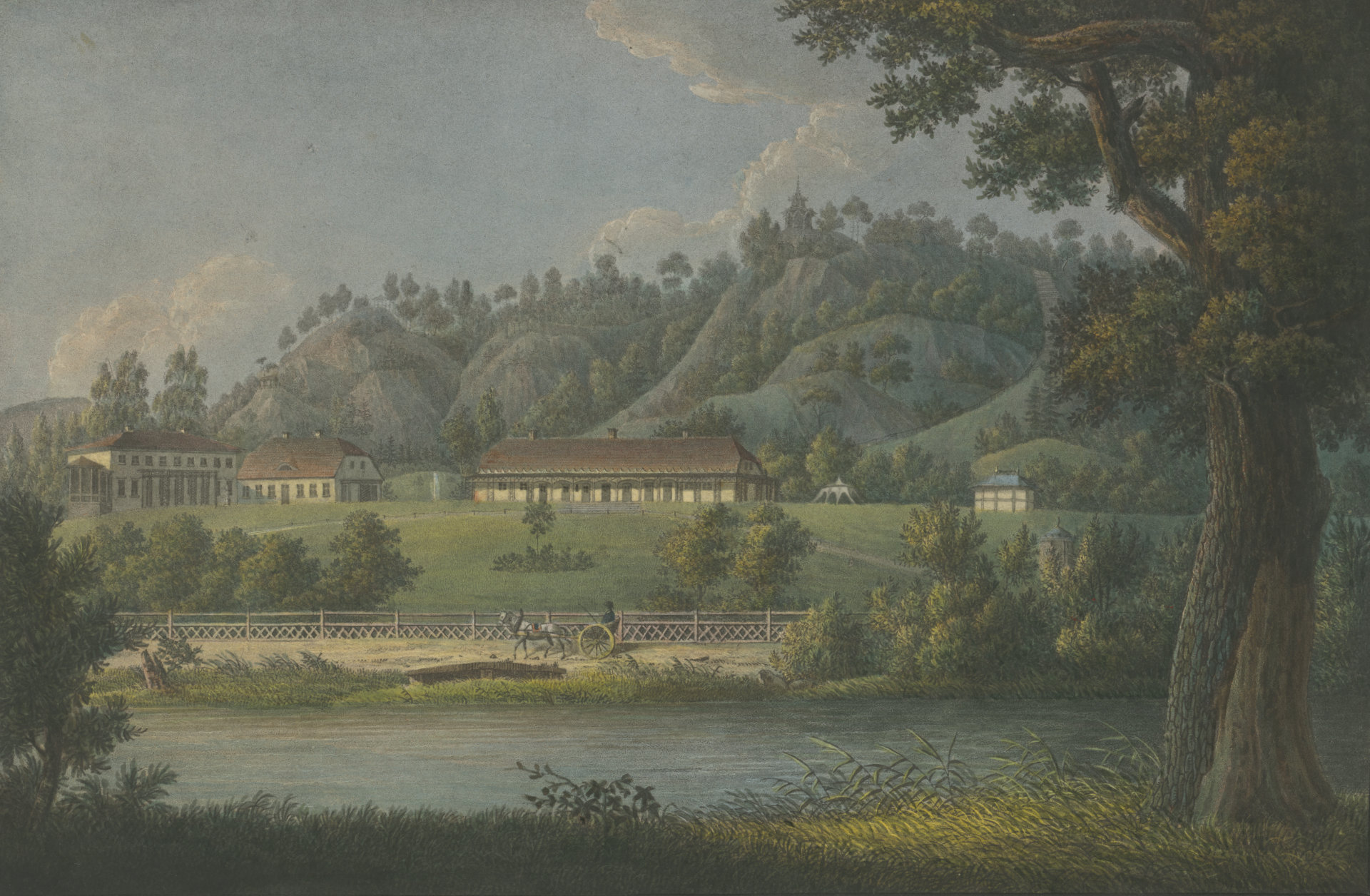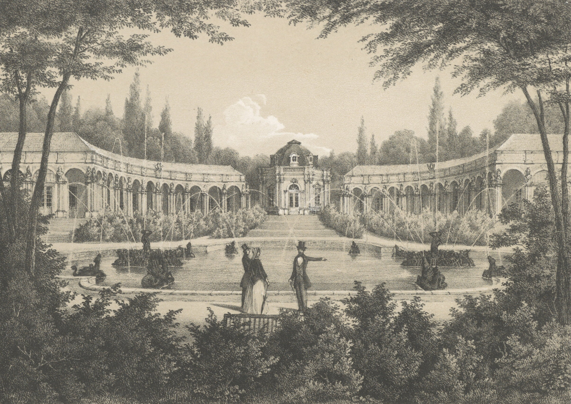 Diese Ansicht gehört zu einer Bilderreihe, die das Fürstenpaar 1825 von Ludwig Eduard Lütke anfertigen lässt, um das von Lucie eröffnete Hermannsbad zu bewerben. Zu sehen sind hier die Blumenbeete des Talgartens und die Badeberge mit ihren Aussichtspavillons.
