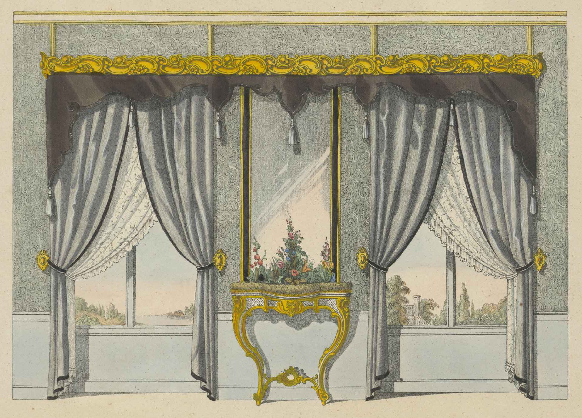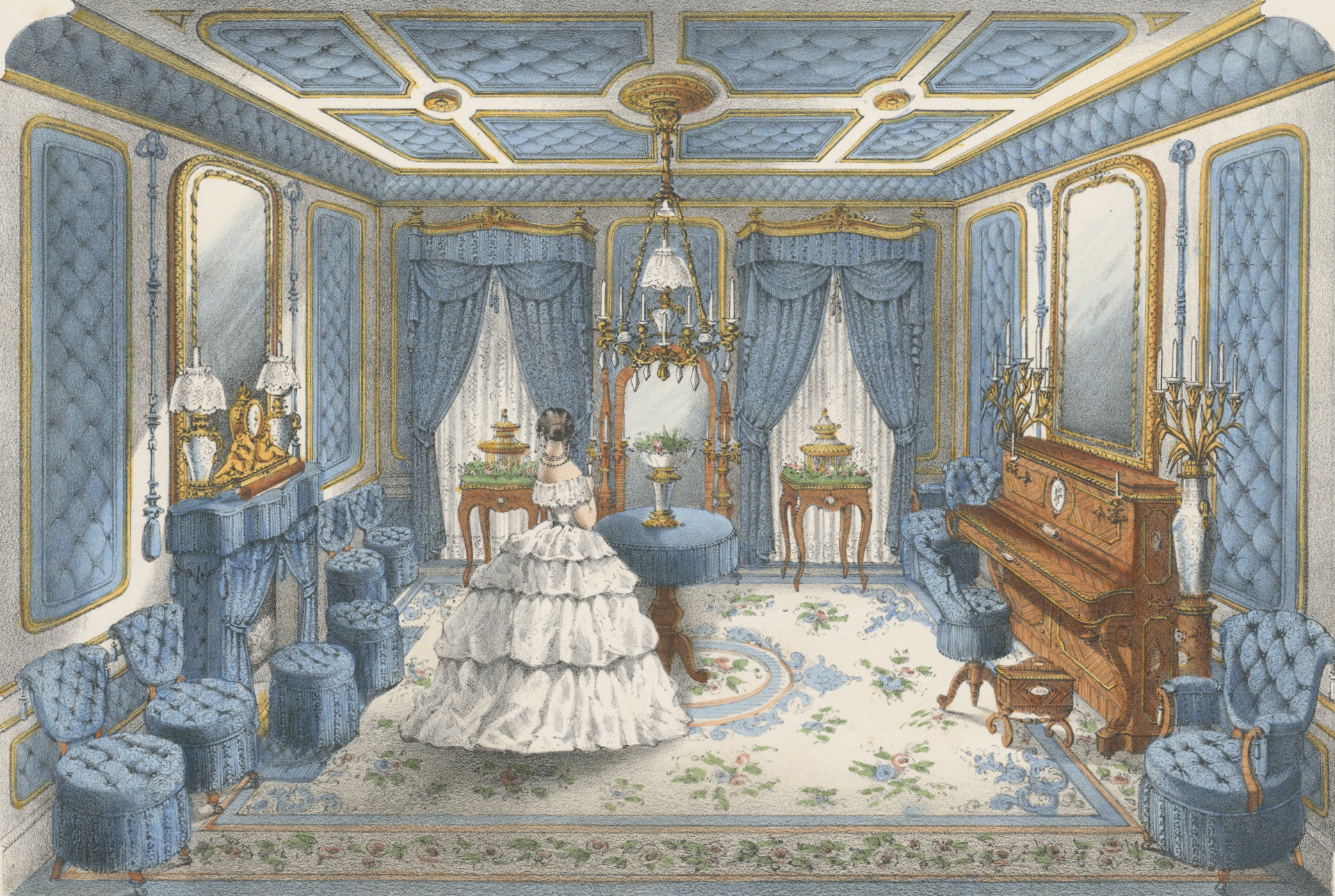 Das Garde-meuble-Magazin des Künstlers Désiré Guildmard inspirierte Adel und Bürgertum ab 1839 fast einhundert Jahre lang in Einrichtungsfragen. Da auf diesem Blatt Titel- und Urheberangaben fehlen, handelt es sich vermutlich um eine anonyme Kopie der beliebten Illustrationen aus Guildmards „Wohnzeitschrift“.